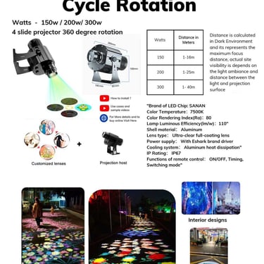 The Esharktek Multi-Gobo Projector with 4 Lenses and Cycle Rotation is a cutting-edge lighting fixture designed to create dynamic, captivating effects of professional lighting environments for Marketing in Showrooms, Eye-Catching Designs Impactful, Pathway lighting in public area,s and Dynamic Safety Signs.