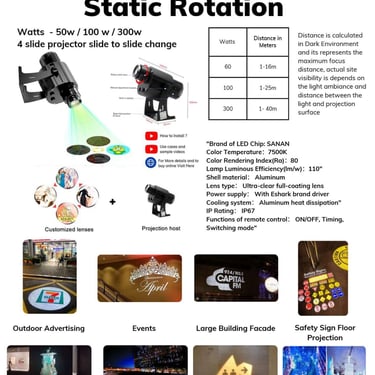 The Esharktek Multi-Gobo Projector with 4 Lenses and Static Rotation is a versatile, high-performance lighting tool designed to deliver stunning visual effects for exclusive outdoor decoration for pathways, Dynamic Safety Signs and Marketing. With its ability to project up to four different gobo patterns simultaneously.